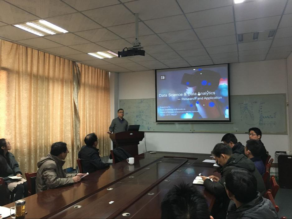 本次报告会中,徐贯东教授首先介绍了悉尼科技大学的概况,以及他所带领的团队的研究方向与人员情况等。随后为我们讲述了数据科学与数据分析学科的研究发展历程,以及在各个学科中的应用,并结合其团队近期发表论文,介绍数据科学在用户行为建模、文本挖掘、情境感知的音乐推荐、认识学习建模等方面的最新应用成果。最后重点讲述了面向性格分析和健康保险的两个典型数据科学及应用场景。本次报告使在场师生对数据科学与数据分析有了深入地了解,让我们明白了数据分析应用的广泛性与重要性。报告结束后,徐贯东教授与在场师生进行了详细交流。
