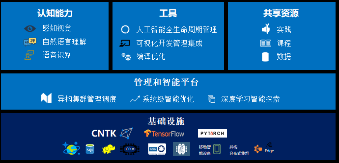 此外,微软人工智能工具覆盖了开发、调试、部署的整个项目生命周期,其示意图如下图所示。该工具基于Python 跨平台可视化开发,具有完整的 AI 项目全生命周期管理,可扩展、全开放、全面支持主流框架,充分利用 AI 混合云平台和资源提供了一系列的人工智能工具。