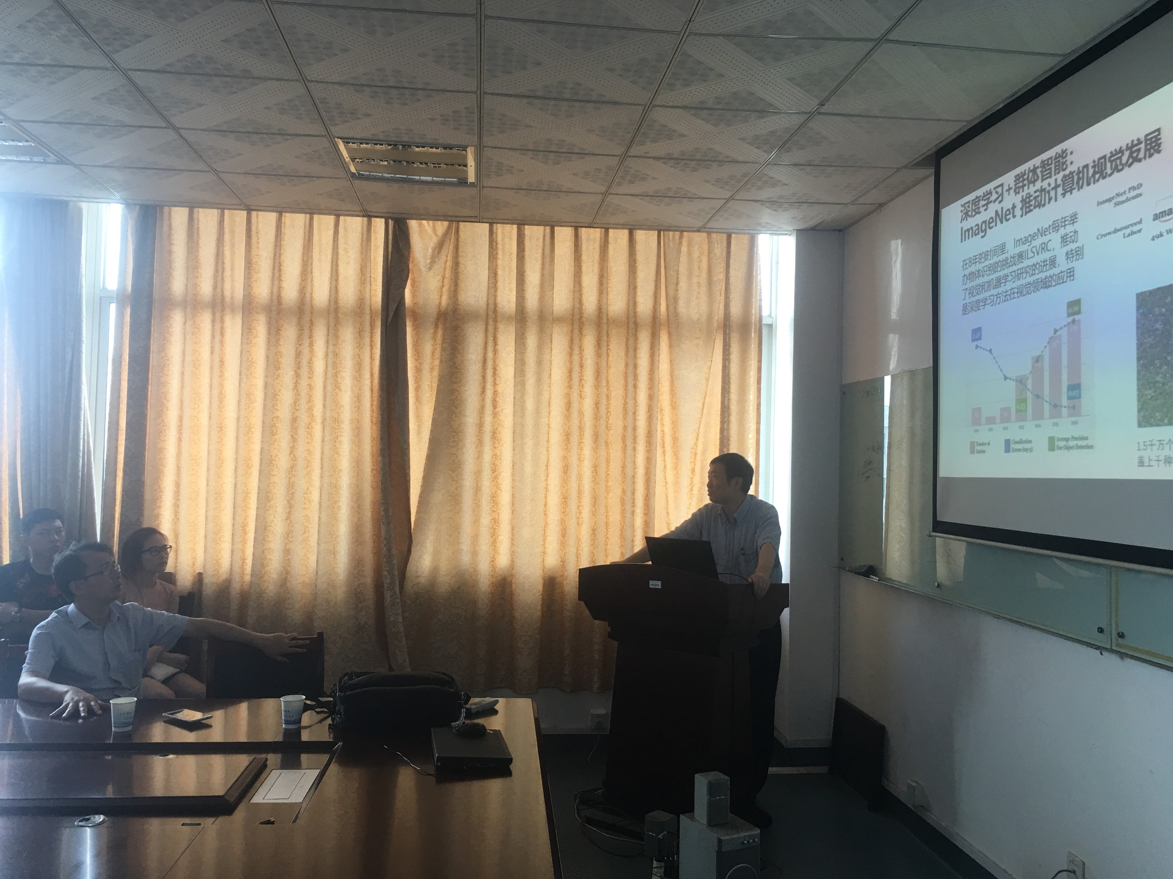 首先,吴文峻教授以“群体智能研究”为主题,提出了信息网络,物理,人类社会的三元空间结构在人工智能迈向2.0时的新发展、新挑战。接下来吴文峻教授利用“深度学习+群体智能:ImageNet推动计算机视觉发展”这一具体实例与会场师生进行了深入的探讨。吴文峻教授在本次讲座中就“群体智能研究”发表了独到的见解,条理性强,内容丰富,开拓了在场师生的学术视野。报告后,学院师生与吴文峻教授就智慧城市、群体智能等相关问题展开了热烈的讨论。