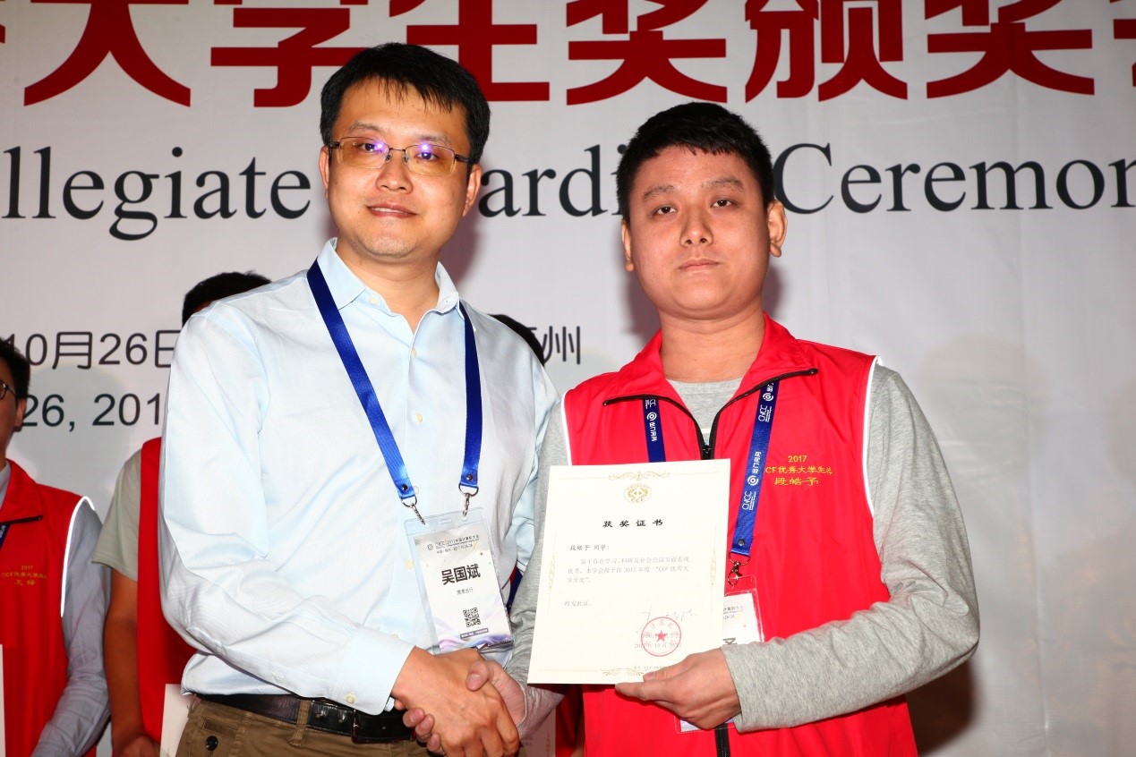 2017年度中国计算机学会“CCF优秀大学生奖(The CCF Elite Collegiate Award)”颁奖大会于今年中国计算机大会(CNCC 2017)期间在福州举行。我院14级计算机科学与技术专业优秀本科生段皓予获此殊荣,参加了中国计算机大会,并在大会上领奖。