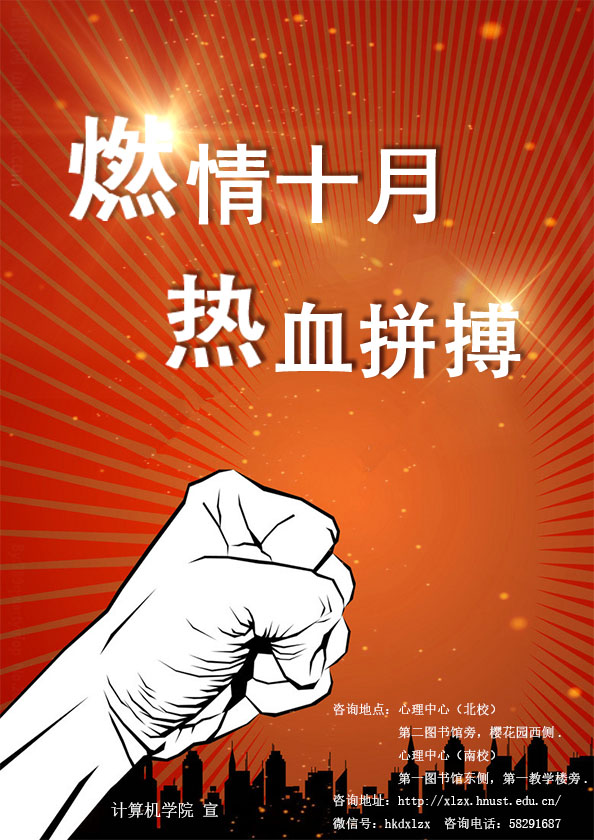心理健康 心理海报 您所在位置: 首页 > 学生工作 > 心理健康 > 心理海报 心理海报(17年.10月) 时间:2019-03-07 作者:心理健康部 访问量: 中国·yl23411(永利)集团官网-Official Website 燃情十月 热血拼搏 青春喷薄如火,热烈如血; 十月燃情青春,膨张热血; 用挥洒的热血泼墨十月的拼搏!