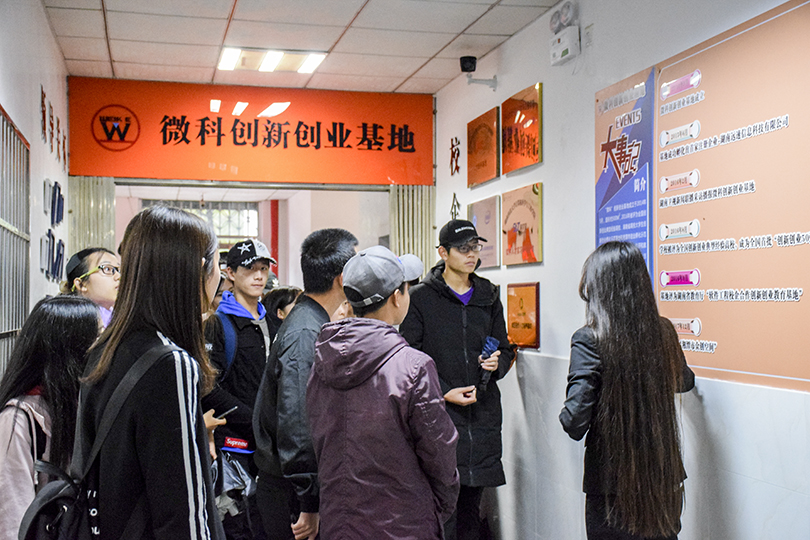 紧接着的互动环节以有奖问答的形式开展,在座同学热情高涨,老师也积极参与其中。而后,我院微科创新基地的优秀团队代表Maker-Iot团队和Kingcola团队分别向大家分享团队技术成果和比赛经验。最后,主持人王漠带领同学们参观了微科创新创业基地。参观期间,她还为大家详细讲解了基地各工作室的基本情况。