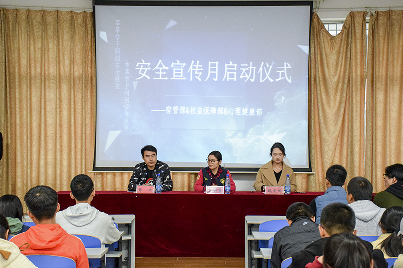 为加强学生安全防范意识以及对心理问题的关注,提高寝室的安全水平,建立良好的宿舍关系,11月6日下午2点,我院安全文明宣传月启动仪式暨心理健康教育安全知识讲座于逸夫楼108会议室顺利开展。辅导员陈苗苗、魏庆龄、张政出席,团委学生会主席团,17、18级各班团及18级全体寝室长与会。本次仪式由陈佳男主持。