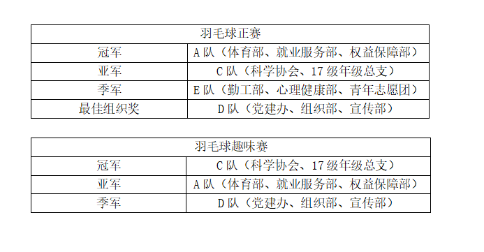 本次比赛分为男子单打、女子单打、混合双打三个项目,以小组车轮战的形式确定决赛圈的队伍,再通过两两PK决出前三名。球场上,运动员们努力拼搏,扣球、飞身救球、对打等精彩瞬间不断呈现。场边的队员热情欢呼,拍手叫好,一度将比赛气氛推向高潮。最终,由体育部、就业服务部、权益保障部组成的A队更胜一筹,赢得本次比赛的冠军。正式比赛结束后,羽毛球趣味赛给赛场营造了一种轻松愉快的气氛,同时也给一天激烈的比赛画上了圆满的句号。“今天的比赛很激烈,我特别开心,队员们的热情也让我感受到团队的力量,希望今后能有更多类似的活动,我一定积极参与。”18级文体总支林逸鑫说到。