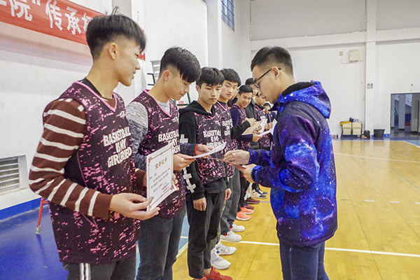 赛后,闭幕式正式开始。首先,由我院体育部部长王福强发表闭幕词。他指出今年举办的“传承杯”在继承传统的同时又增添了新意,从真正意义上做到了团结我院全体师生。随后,他代表我院团委学生会向运动员们表示热烈祝贺,并对裁判员及工作人员的辛勤付出表示由衷的感谢。他还希望运动员不仅要将敢拼敢赢的体育精神体现在赛场上,更要让它在生活中发光发热。紧接着,球员代表吴定伦发言。他说道:“‘传承杯’不仅能让我们与其他年级切磋球技,而且也让同学与老师之间建立了深厚的友谊。希望此次比赛能被一直延续,成为学院的特色。”最后,由袁枭淘宣布获奖名单,17级篮神队夺得冠军,16级少先队获得亚军,15级夕阳红队获得季军,老师研究生联队获得“优胜奖”,18级狼辰队获得“最佳组织奖”。此外,朱建军老师荣获“最有价值球员”。