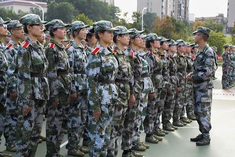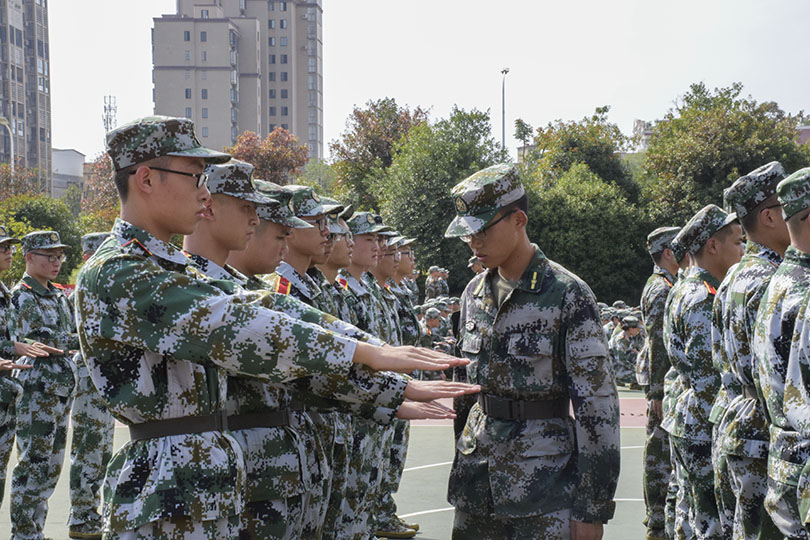 一身戎装,同学们都自觉秉持着军人们的严谨精干,坚定不移的信念。伴随着各排教官稍息、立正的号令,军训正式拉开了帷幕。一个一个看似简单的动作,想要做到标准却并非易事。听着号令的同学们也随之做出反应,从一开始的杂乱无章,到后来的整齐划一,教官们的训练卓有成效,一个个身着绿色军装的身影,在篮球场上仿佛是一道靓丽的青春油画。尽管同学们脚底发麻,腿部酸痛,但依旧没有选择放弃。