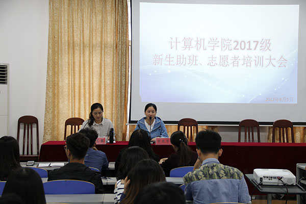 9月5日下午,我院2017级新生助班及迎新志愿者培训大会于逸夫楼108室召开。学工办负责人肖爱军,辅导员王艺蓉、易靓靓出席会议,2017级全体新生助班及迎新志愿者参加会议。会议由王艺蓉老师主持。
