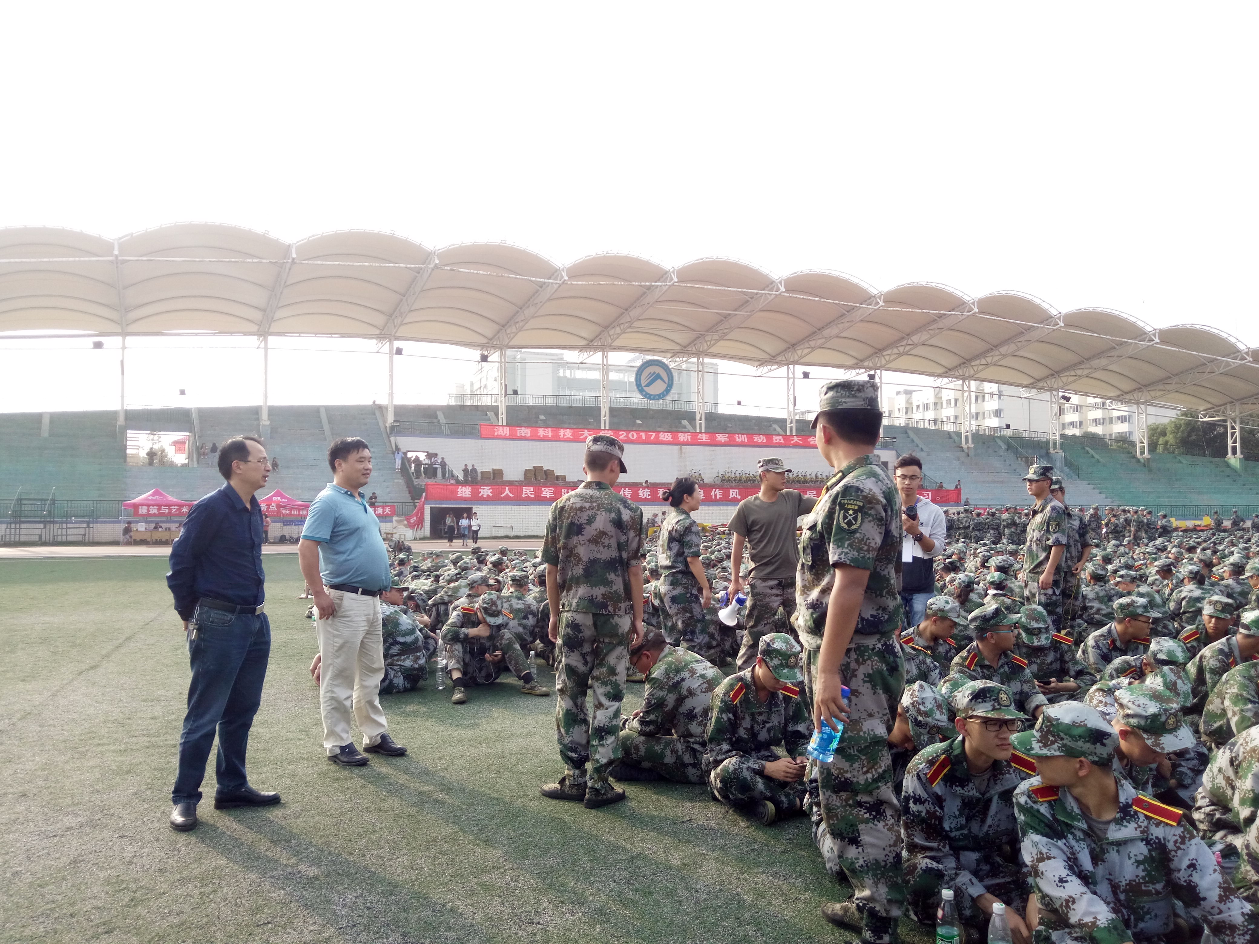 首先,刘红阳、刘建勋以及周筱芬到北校田径场看望正在进行摆字排练的同学们,要求同学们在摆字的过程中要听从教官的指令,服从指挥。在练习场地里不开小差,做到遵纪守礼,保持大学生的素养,希望同学们能够好好练习,在表演中展现出17级学生的风范。