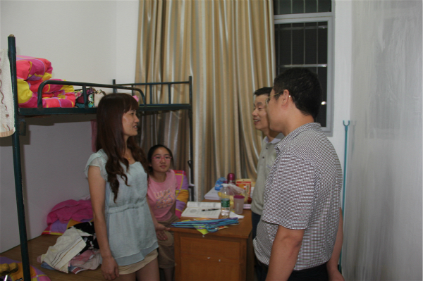 9月11日下午6点许,我院党委书记万启常,院党委副书记曾治国,2015级辅导员老师吴成义赴学生宿舍8区18栋119宿舍慰问新生廖莎莉。
