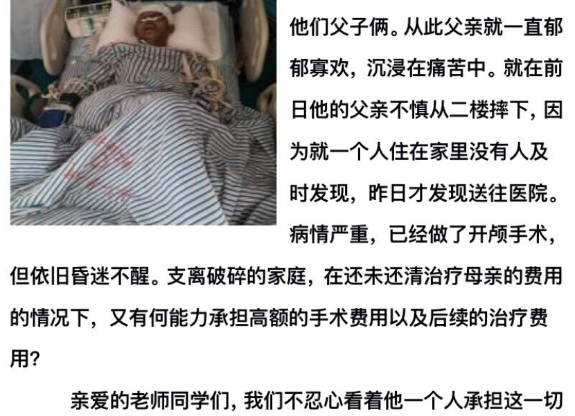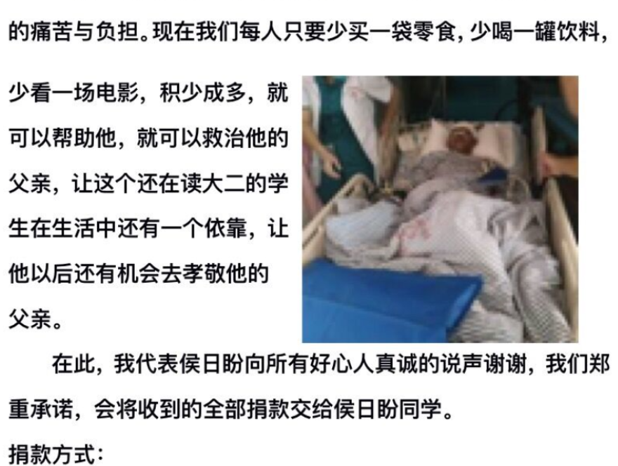 目前,侯同学表示父亲已经脱离生命危险,现已转出重症监护室正在恢复期,并对所有为他提供帮助的师生们以及社会各界人士表示最诚挚的感谢。最后,祝愿侯同学的父亲能够早日康复,家庭能够尽早渡过难关!