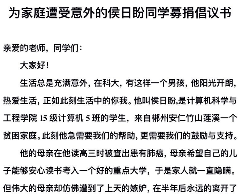 “人间处处有真情,真情时时暖人心。”8月9日,我院得知15级侯日盼同学的家庭遭遇困难之后,向全学院师生,校友以及社会各界发起了爱心募捐。