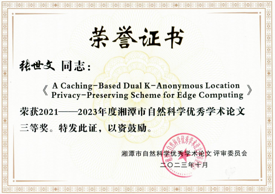 近日,由湘潭市科学技术协会、湘潭市人力资源与社会保障局、湘潭市科学技术局、湘潭市财政局组织的2021-2023年度湘潭市自然科学优秀学术论文评选结果揭晓,我院梁伟教授撰写的《Spatial-Temporal Aware Inductive Graph Neural Network for C-ITS Data Recovery》论文获得一等奖,张少波教授撰写的《ALPS: Achieving Accuracy-aware Location Privacy Service via Assisted Regions》论文获得二等奖,张世文副教授撰写的《A Caching-based Dual K-Anonymous Location Privacy-Preserving Scheme for Edge Computing》论文获得三等奖。