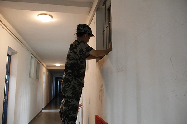 七区十栋一单元的一间男生寝室里,四个男生按照教官教给他们的技巧,齐心协力地将一张棉被叠成有棱有角的豆腐块,即使不太熟练,他们也没有一丝不耐烦亦或是不情愿。距离检查不到半个小时,新生们加快速度,不放过任何一个卫生死角,他们分工明确,不慌不乱,从房间到卫生间,从地面卫生到一个小小的茶杯摆放,他们细致打理,丝毫不放过任何一个角落。