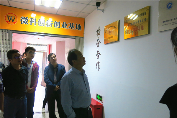 10月11日下午,湘潭市就业局副局长刘雄湘率2016年度湘潭市市级创业孵化示范基地考核组一行来到我院,在院党委副书记曾治国、学工办主任吴成义的陪同下深入微科创新创业基地进行考察并指导工作。