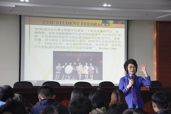 会议伊始,周栋向同学们对周谦教授进行了详细的介绍,并代表学院全体师生对周谦教授的到来表示热烈欢迎。首先,周谦教授向同学们说明了ETIE项目内容及选拔条件。项目包含:3+1本硕连读项目、4+0.5+1的研究生项目等,各项目对学生的要求不一,能够给予学生更多机会。紧接着,她展示出的ETIE outcomes、why ETIE、ETIE student feedbacks三个模块更加深入全面地带领了同学们了解项目内容及学校环境。在接下来的互动交流环节,周谦教授对在座学生提出的问题一一耐心解答。随后,刘文娟具体讲解了报名要求及注意事项,鼓励同学积极参加。最后,周栋致结束语,本次ETIE学生交流项目事宜宣讲会圆满结束。