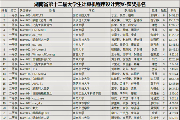 我院派出ACM集训队中精英队员参与此次竞赛。在程序设计类竞赛中,一百多支队伍,用团队的智慧,和时间赛跑着。派出参赛的4支代表队中,湖南科大一队(肖超群、赵志轩、唐志强)以第六名的好成绩斩获一等奖,湖南科大二队(滕亚均、肖罗罗、张晔华)和湖南科大三队(王春、王智杰、袁泉)同时斩获二等奖。最后,我院四支优秀队伍为我院夺得了团体第六名的荣誉。