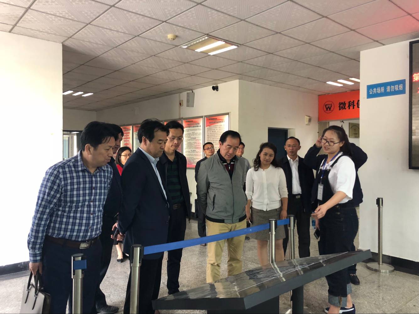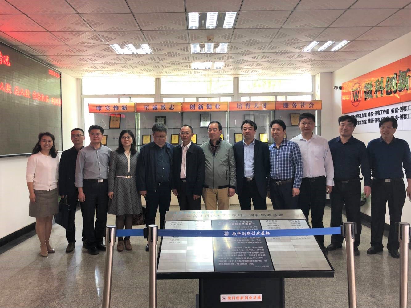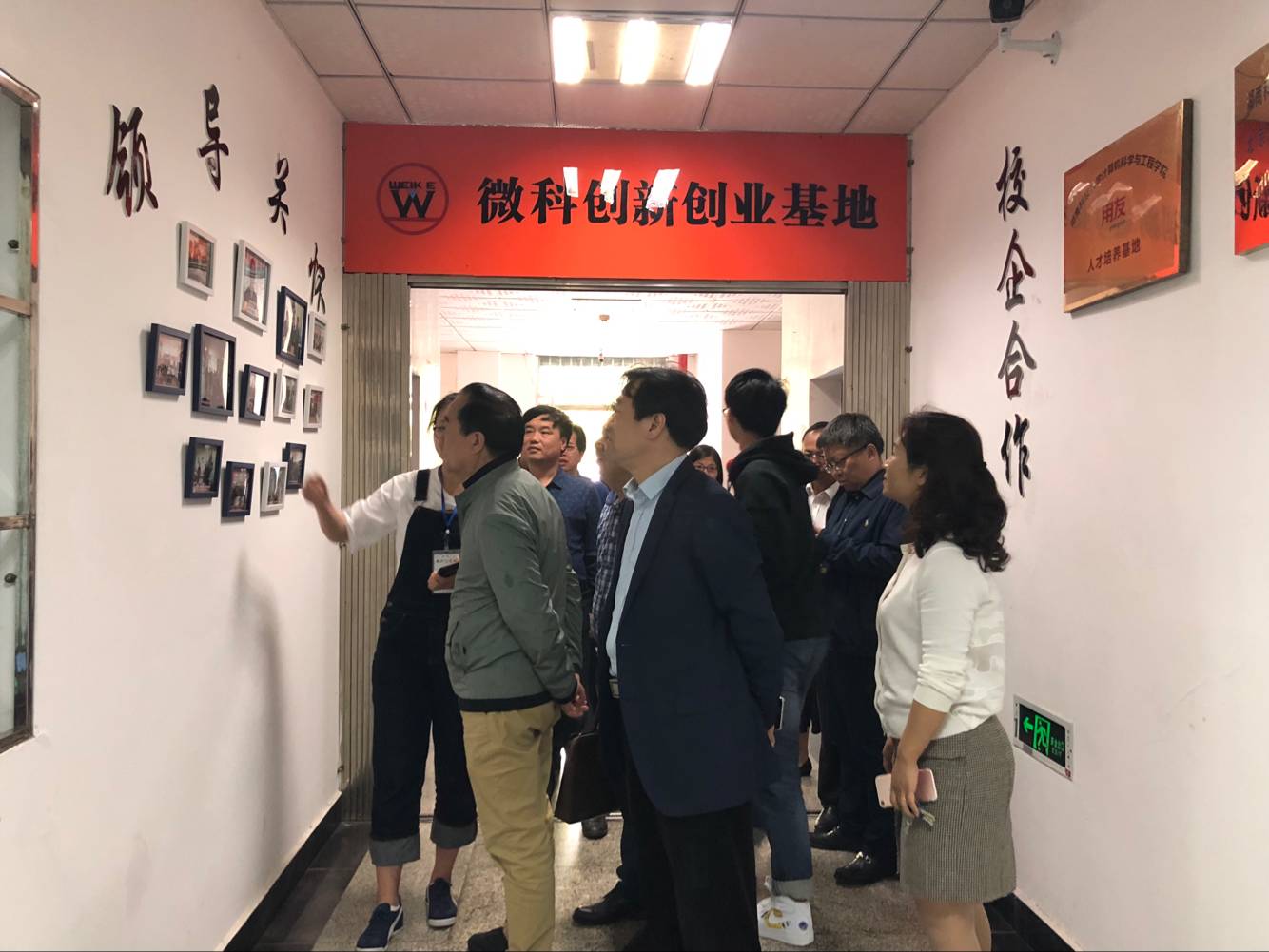 在讲解员的带领下,蔡畅元等人先后参观了我院微科基地的科学技术协会办公室、微科逐梦办公室及"唯实"、"惟新"、"至诚"、"致志"、"立德"五个创客工作室。在了解到"微科"两字所蕴含的意义和各实验室的基本情况后,蔡畅元对我院微科创新创业基地取得的丰硕成果表示充分肯定。最后,蔡畅元一行在我院微科基地前合影留念。
