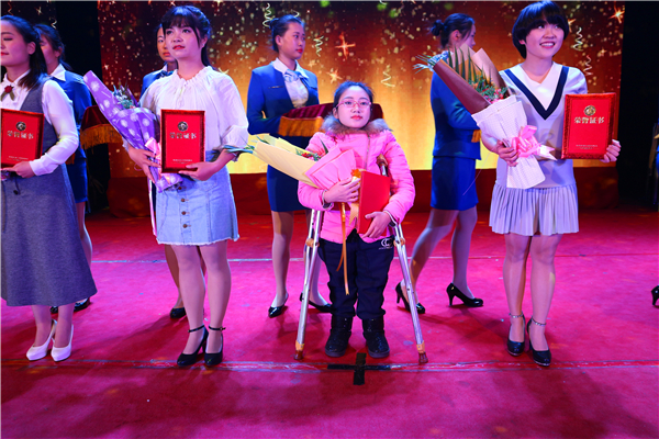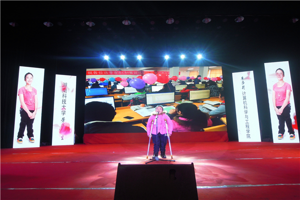 经过初选,网络投票及现场评选等环节,共有10位优秀女生脱颖而出参与此次报告会,她们用青春浇灌梦想,勇敢、坚毅、拼搏,她们是时代的骄子。其中来自我院15级网络工程二班的廖莎莉,虽患先天性脆骨病,却用惊人的毅力和信心抗击着命运带来的苦难,以芳菲为翼,搏击人生,她用拐杖站在台上的那一刻,台下已掌声雷动。“整整高中三年都在学习走路”,谈及生活艰苦之处,廖莎莉面带苦尽甘来的微笑如是说道。