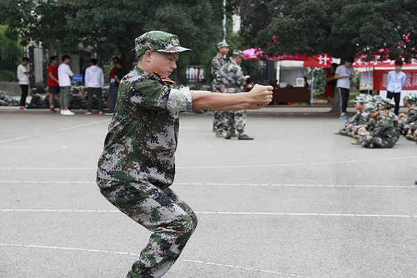 休息期间的军训场地传来阵阵惊呼与呐喊。教官一改军训时的庄严凝重,亲自教授新生们学习军体拳。看着教官的飒爽英姿,有的同学忍不住毛遂自荐,迫不及待地想要学习新的东西。可是因为新学的动作做得不够标准,而引来了同学们捧腹大笑。