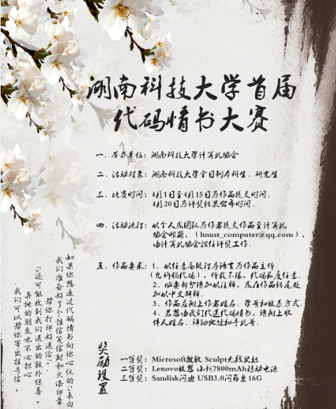 由我院计算机协会主办的首届代码情书大赛与4月20日圆满落幕。此次大赛面向全校同学征集作品,共收到来自15个学院的五十余份作品,经过大赛委员会的评选,于20日完成评奖工作。